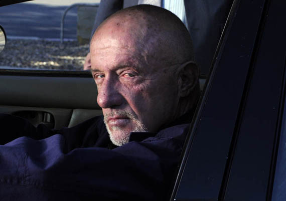 Promptly in the next scene, the DEA raid Mike’s place. Mike sits calmly in front of the TV watching an old noir film while the agents comb through his stuff. Hank glances at Mike and looks pensive. Gomez looks at Hank gravely and shakes his head. Nothing to be found.